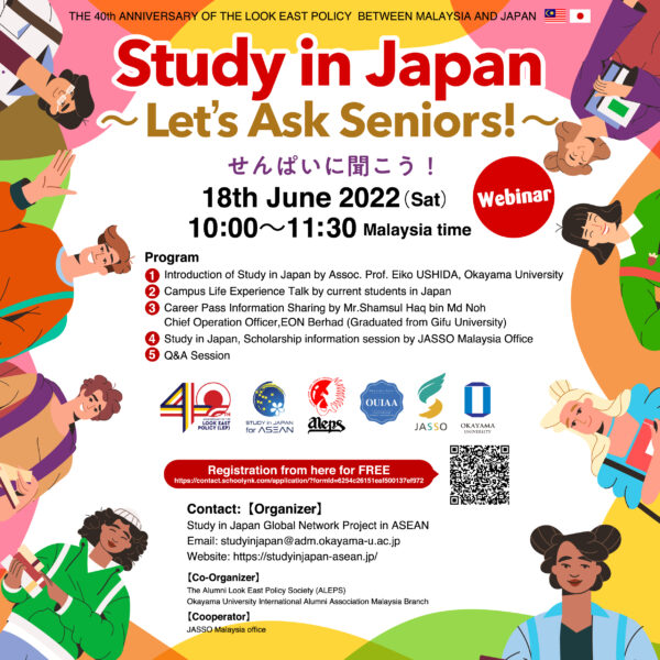 🌐Study in Japan Global Network Project and OUIAA Malaysia Branch will hold a Study in Japan Webinar – Let’s Ask Seniors! – as an event of the 4th Anniversary of the Look East Policy, together with ALEPS.