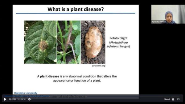 In this webinar, the speaker introduced her Plant Pathology laboratory in Okayama University. In her presentation entitled “Endogenous suppressor in Arabidopsis thaliana plays a role in the trade-off between growth and defense”, Aprilia Nur Fitrianti explained the basic principles of attack by infectious microbes (pathogen) on plants. She said that many studies on pathogens have been carried out, but the mechanism of how plants respond to these attacks is still rare. Therefore, she was interested in investigating this mechanism by using the model plant Arabidopsis thaliana. This research is a valuable breakthrough in the field of interaction between plants and microbes. In addition, these findings also open new perspectives on the mechanisms of immunity in plants.