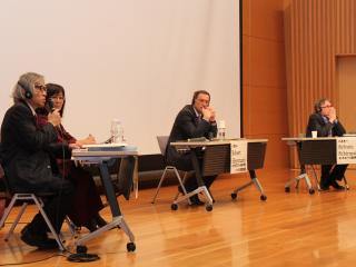 講演後は荒木勝・社会貢献・国際担当理事を進行役に、「ストラスブールのまちづくり」の著書であるヴァンソン藤井由実さんを交えて、ヘルマン氏、シルマン氏が会場の参加者と対話し、「学都」を実現させるまちづくりの方策について考えました。