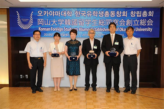 2012年8月18日韓国、ソウル(ロッテホテルソウル)で韓国支部設立大会が開催されました。韓国支部は岡山大学に韓国人が留学してからちょうど30年目を迎えた年に設立されました。岡山大学を修了、あるいは、短期留学等の経験を持つ韓国同窓生が韓国各地から40名集まりました。岡山大学からは森田学長を含めてスタッフの計10名が参加し、駐韓日本国大使館関係者、JSPS 関連団体、及び岡山大学と締結を結んでいる成均館大学、圓光大学、梨花女子大学、東国大学など大学関係者を来賓として迎え、盛大に行われました。韓国支部の初代会長は大邱韓医大の李ジンテさんが選出されました。韓国支部からは今回の記念式に出席した森田学長を含め4名のスタッフに感謝の気持ちを込めた記念盃が送られ、今後、岡山大学と支部間のネットワークの活性化して岡山大学の絆を深めたいと述べました。