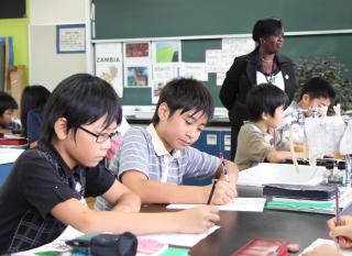 教育関係者らは、分数や燃焼、光合成を学ぶ6年生の授業を担当。アフリカの子どもが好きなゲームを紹介して導入部分から授業に引き込み、「授業のめあて」を自分で考えさせるなど“学習者中心”の授業を展開しました。