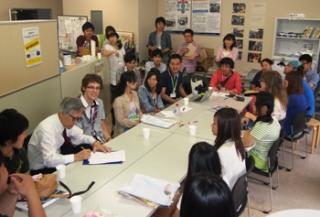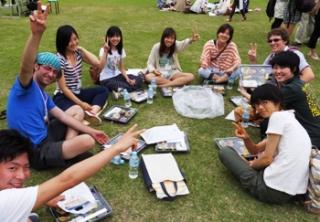 | 岡山城を見学する留学生ら | ピクニック後の意見交換会 |