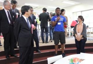 セレモニーには森田潔学長をはじめ、阿部宏史教育担当理事、栗原考次入試・言語教育担当副学長(言語教育センター長)、教職員、学生ら約100人が出席。森田学長が「L-cafeで留学生と本学学生との交流が深まり、さまざまな国から多くの学生が日本へ留学することを期待している」と英語であいさつ。阿部理事や栗原副学長らと看板の除幕式を行い、開設を祝いました。