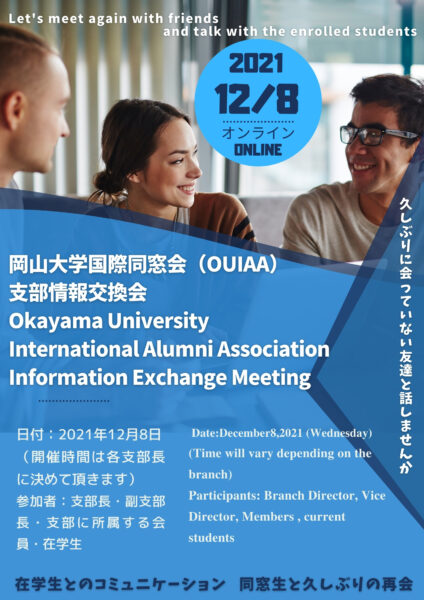プレイベント情報交換会の開催について カテゴリー:お知らせ 令和3年12月08日(水)に岡山大学国際同窓会では、創立10周年を迎えます。今回、10周年イベントとして総会に先立ち同窓会員と在学生の絆を深めるために「プレイベント情報交換会」の開催を企画します。 詳細については、以下のプレイベント情報交換会専用募集ページをご確認ください。 皆様のご理解とご協力をお願い申し上げます。 ⇒詳細はこちらから