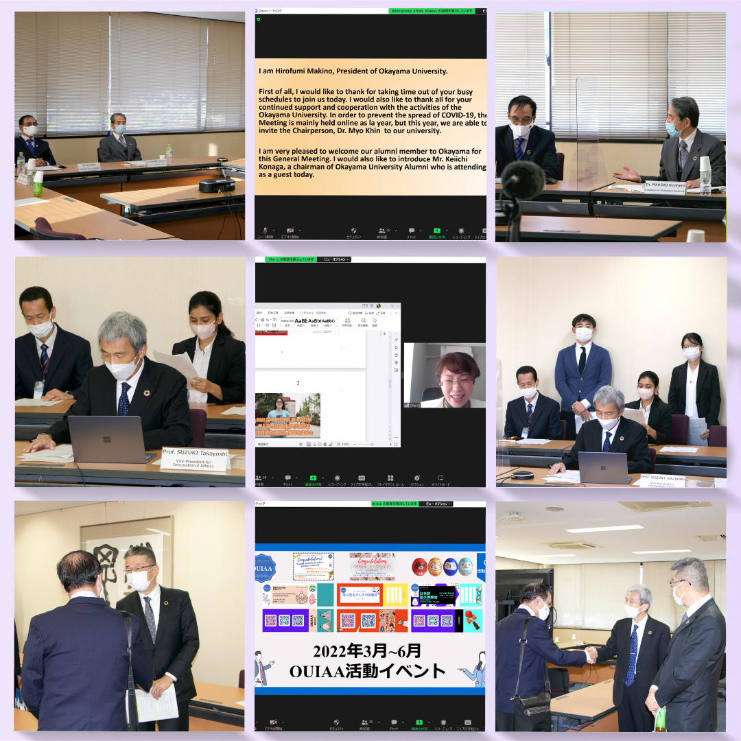 2022年10月21日(金)、第12回岡山大学国際同窓会総会が開催されました。今年は、ミャンマーから会長のMyo Khin先生を岡山にお招きし、対面とZoomを併用したハイブリット形式での開催が叶いました。