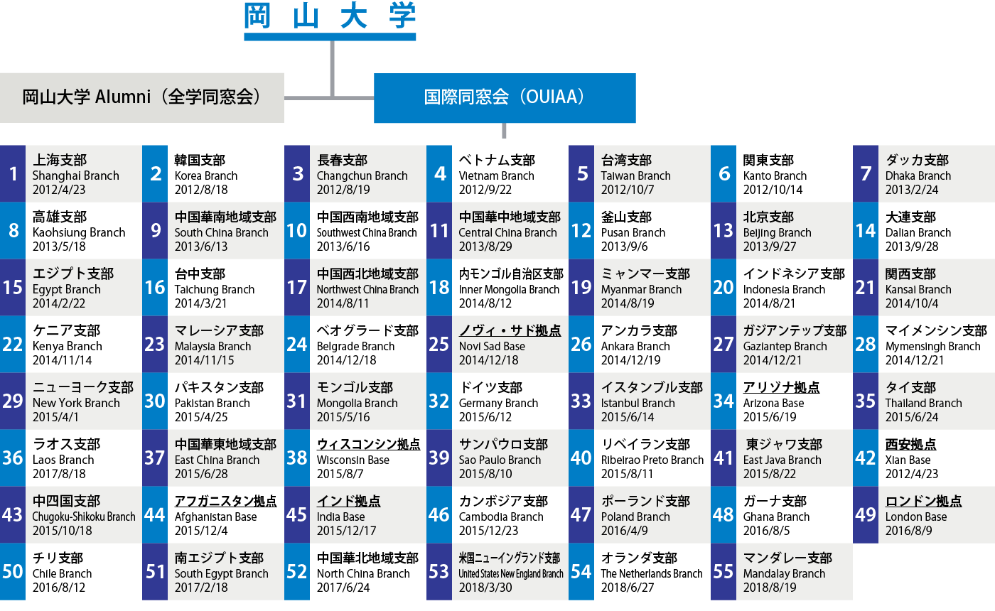 岡山大学国際同窓会は、岡山大学に在籍された留学生や外国籍を有する教職員等をはじめとする会員で構成されています。母校と同窓生および同窓生同士の交流を深めるため、世界各国に支部を設立し、学生の交換留学や大学教職員の交流を促進し、母校と同窓生との絆を深めます。2021年4月現在、28か国に55支部(7通信拠点含む)が設立されています。
